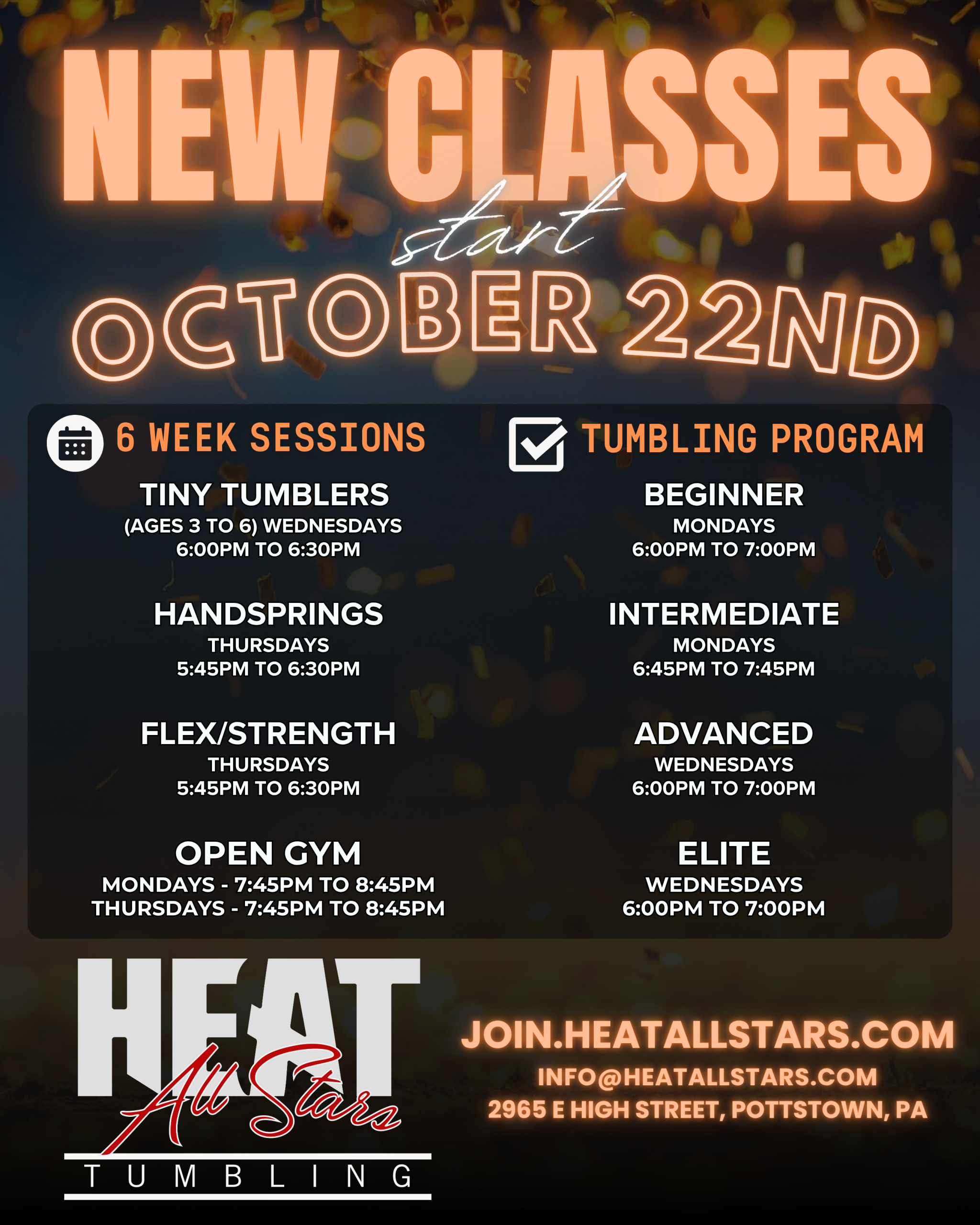 Our 6-week class sessions are perfect for athletes looking to sharpen specific skills in a focused, short-term format. These sessions are separate from our monthly tumbling program and offer a structured, goal-oriented experience.